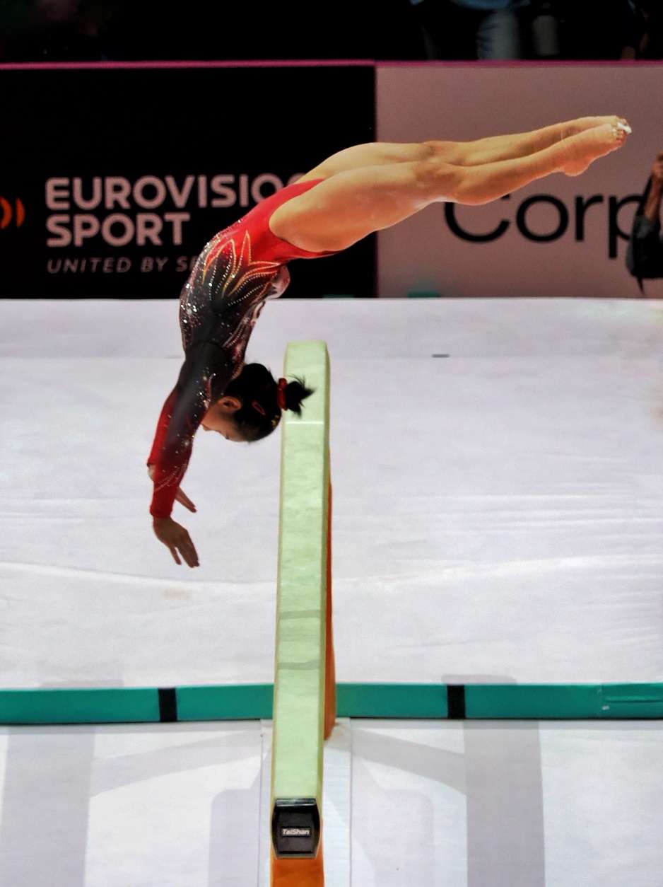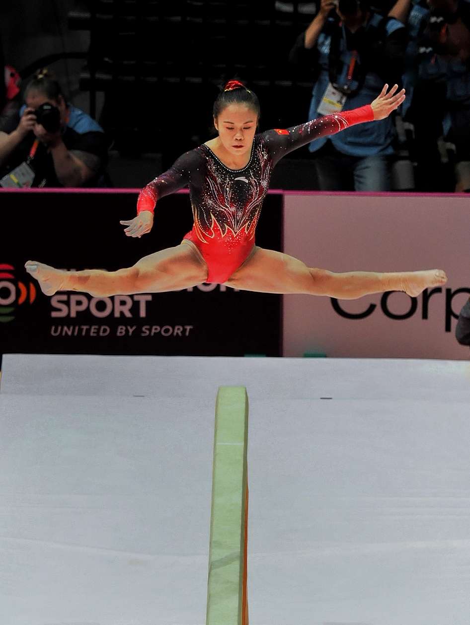根据竞赛规程及抽签结果,10月21日最后一场资格赛上,中国队以平衡木开场。这是中国选手张清颖在进行平衡木项目比赛。